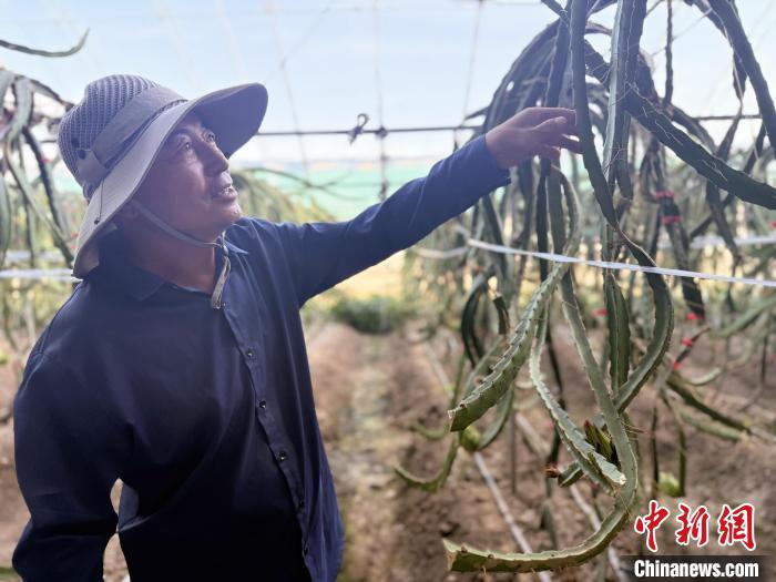 图为韩凤正在打理日光温室大棚里火龙果树。 中新网记者 张玮 摄