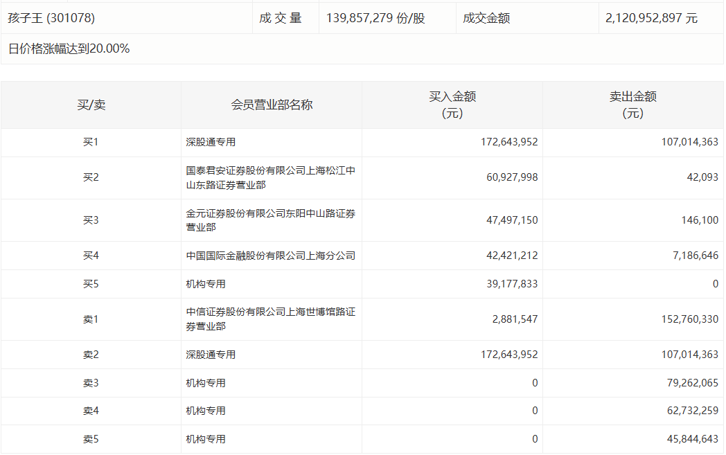0 03-14 16:30孩子王今日20cm涨停,有3家机构专用席位净卖出1.88亿元