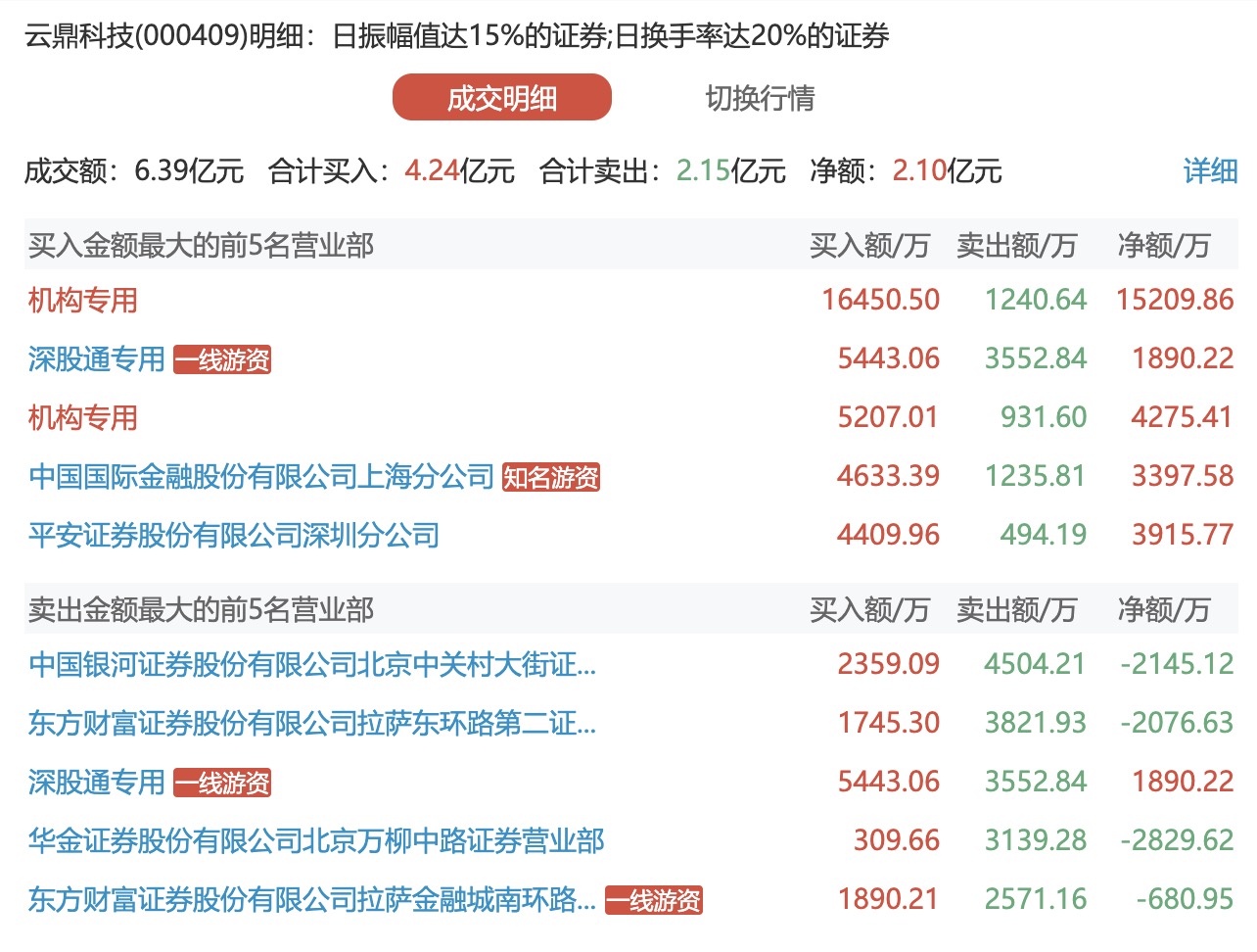 0 03-14 16:29云鼎科技今日涨7.44%,2家机构专用席位净买入1.95亿元